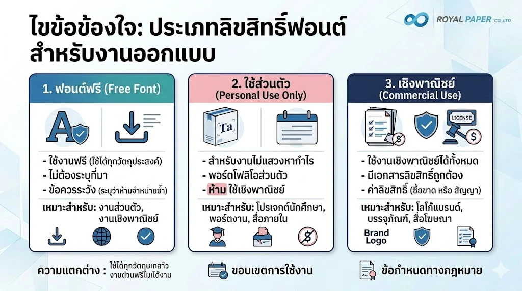 มองหาคำสำคัญ เช่น Personal Use, Commercial Use, Desktop License, Logo Use, Print Use, Webfont, App Embedding เพราะแต่ละคำสะท้อนขอบเขตการใช้งานที่ต่างกัน